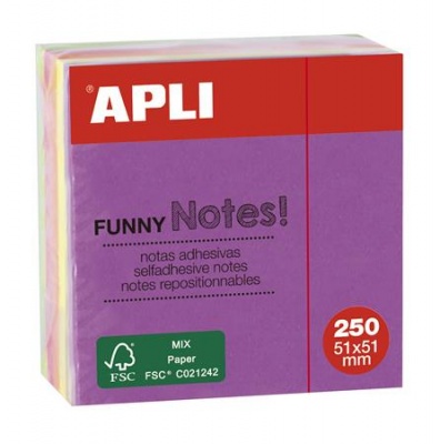 Öntapadó jegyzettömb, 51x51 mm, 250 lap, APLI "Funny", neon