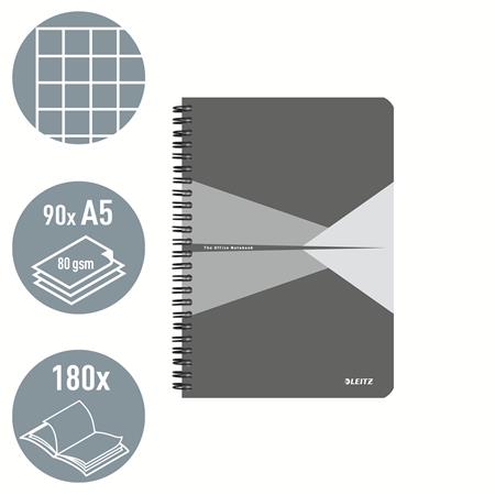 Spirálfüzet, A5, kockás, 90 lap, laminált karton borító, LEITZ "Office", szürke